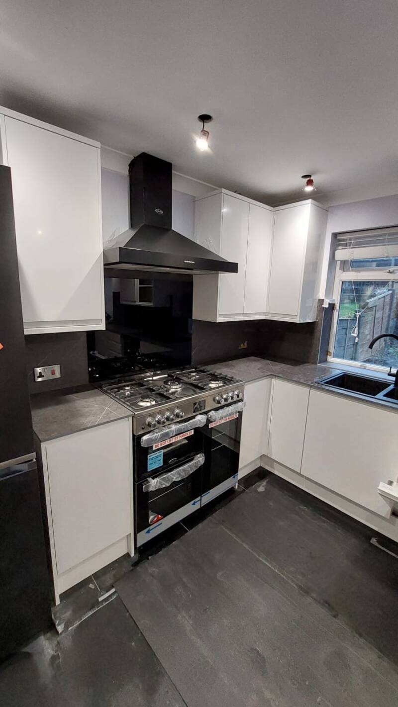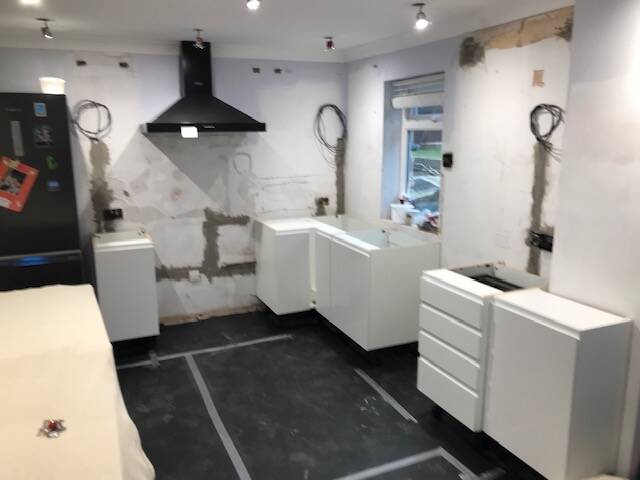 Below is a recent insurance refurbishment, a leak from a bathroom above the kitchen meant that we had to renew the kitchen ceiling, refurbish the electrics and renew the full kitchen including new skirting boards and redecoration.